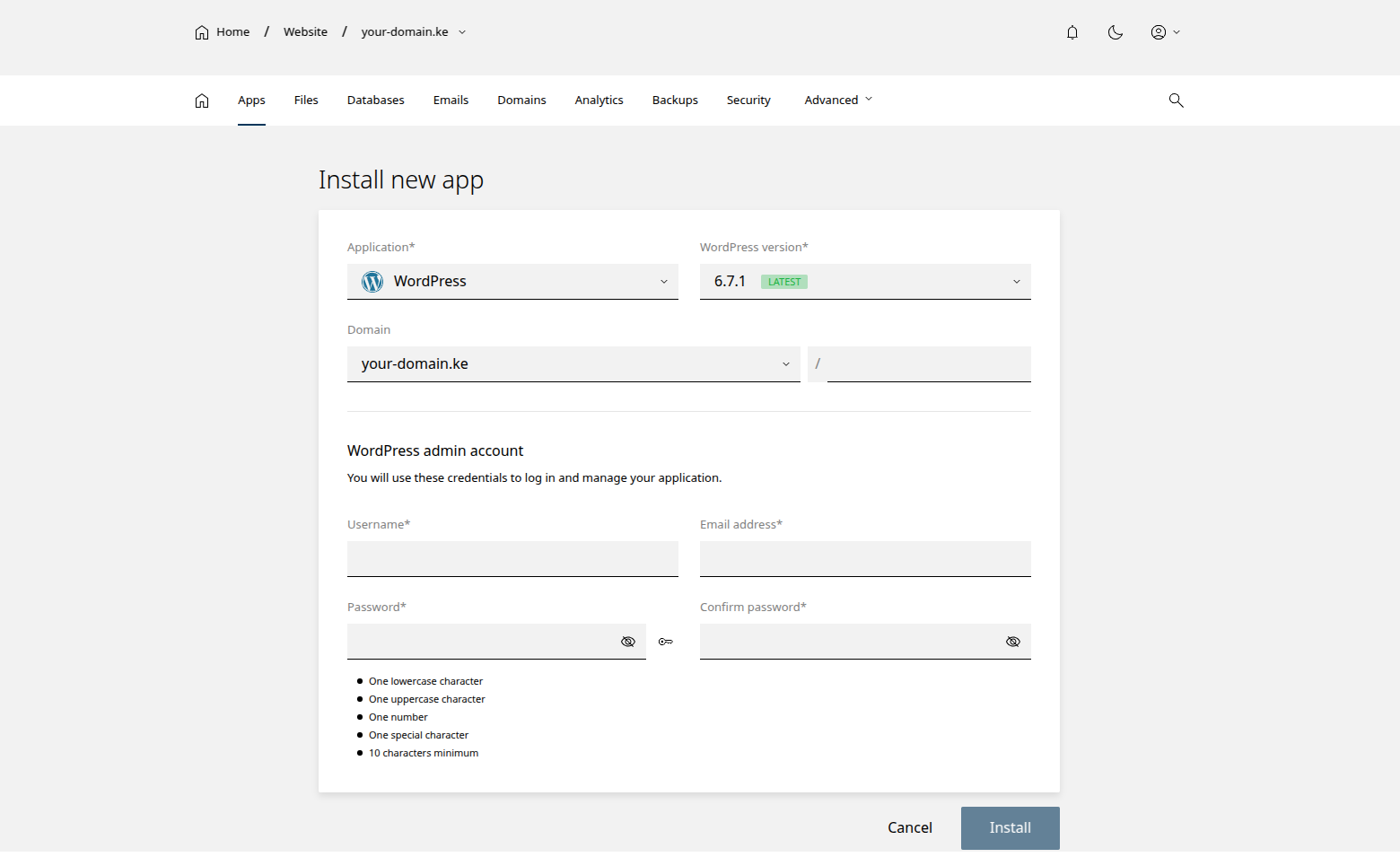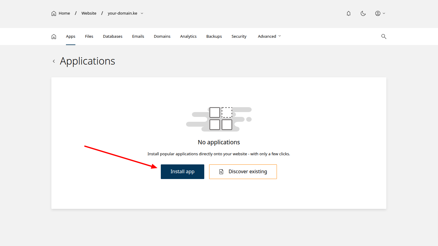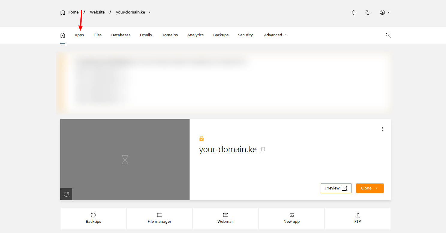 To install WordPress, login to the control panel and click on the domain you want to install WordPress. The click on Apps on the navivation menu as shown bellow: